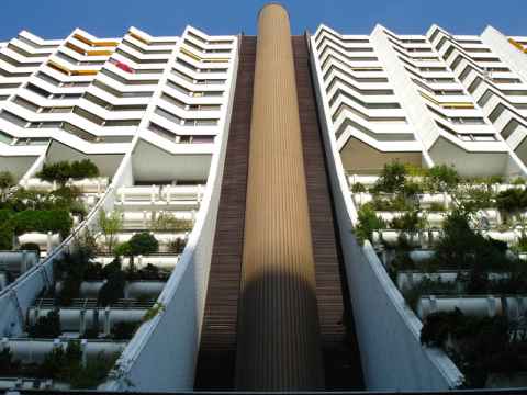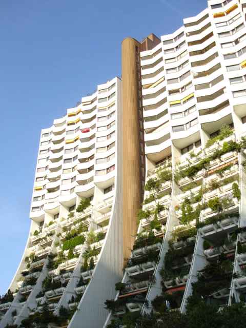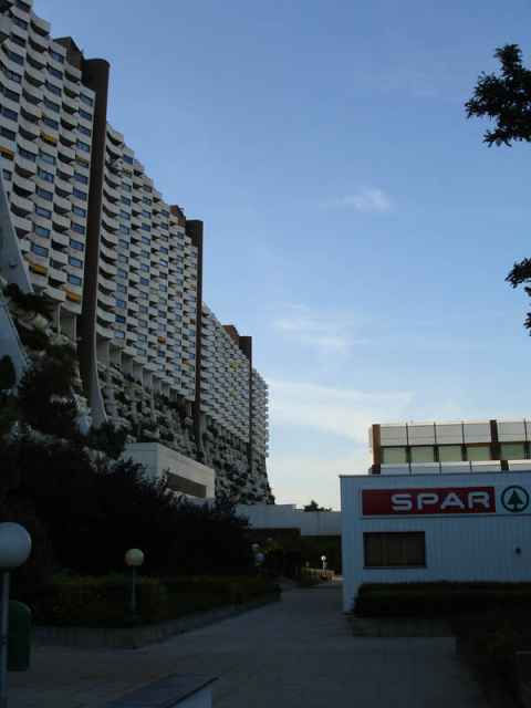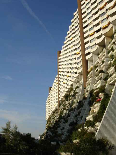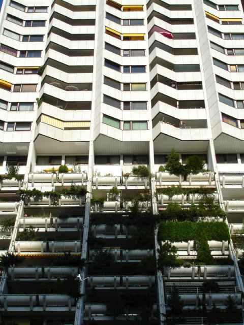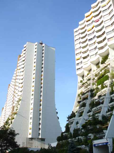 The houses have swimmingpools on top, and are equipped with saunas, communal rooms, etc. The whole complex was built between 1973 and 1985 and is considered a textbook example of residential planning in 1960's Austria. More about these buildings can be found, auf Deutsch, on Wikipedia[b], Alterlaa.net, its own website[c] and Architekturzentrum Wien[d].