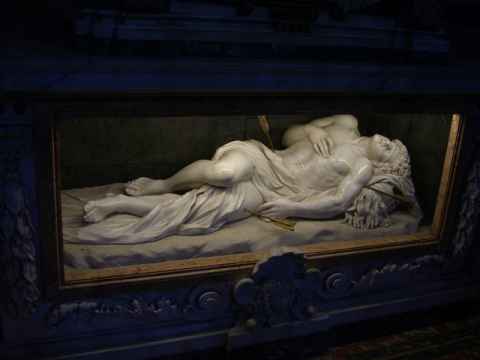St. Sebastian was a Roman soldier, who, during the persecution of Christians had the idea to convert to Christianity. While this was a spiritually magnificent idea from a Christian point of view, from a Roman point of view it was career limiting: He was promptly sentenced to death. The Romans shot him through with arrows but miraculously this did not kill him and he was allowed to appear before Caesar as proof of divine intervention. The emperor, however, decided to disregard the proof. The Romans then promptly switched to plan B and simply beat him to death.