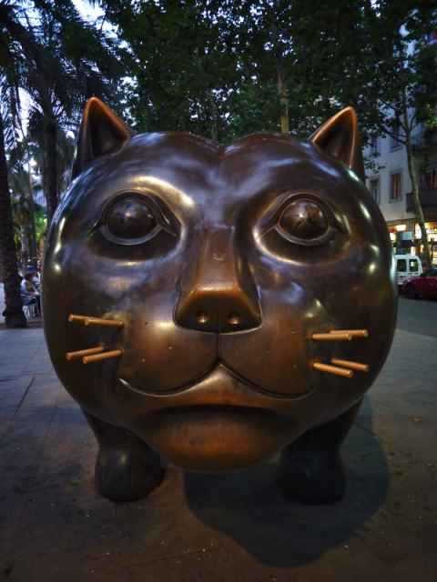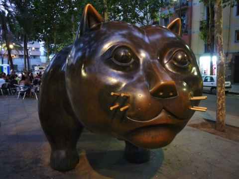 A cat statue by Fernando Botero[a]. The cat started its life in 1987 in Parc de la Ciutadella[b], but was moved to the Olympic stadium in 1992. From there it was placed in Plaça de Blanquerna[c] where it remained until finally moved to its current place at the south end of Rambla del Raval. Lluís-Anton Baulenas has written a nice account of the cat's life so far in Story of a Fat Cat[d].