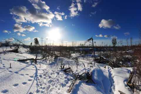 A little while ago I made an attempt at getting to Stensjön, but aborted the attempt at the edge of the burnt area. This time the temperature had been below freezing for a while and with virtually no snowfall, it was much easier to cross the burnt area.