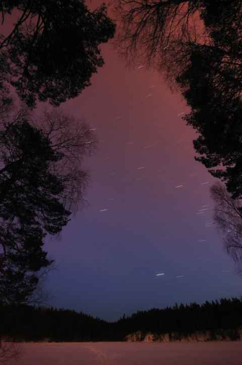My last stop on the way back was at Bylsjön, where I thought I'd do some astrophotography. If you look at the track log for that stop you'll see something that looks like a major GPS malfunction. It is not. I got to Bylsjön about an hour before sunset, and had to wait until about an hour after sunset before the stars became visible. In the evening the temperature fell quite a lot as the sun set, and the low temperature started to have an effect on the battery of the GPS - specifically, it was getting quite low. So I put the GPS in my pocket, trying to keep it somewhat warm in order to get the full hike on the track log. The "splat" of random lines you see is the result of the low temperatures having an effect on me: to wit, making me aimlessly walk around in order to stay warm. In the end, I just did a few long exposures for star trails. After an eight minute one, the result of which can be seen above, the camera's battery gave up. I could probably have gotten a few more shots out of it by warming it up, but by now the whole concept of "waiting for something in the cold darkness" had worn out its welcome.