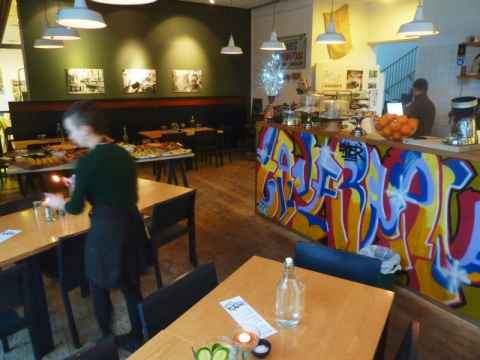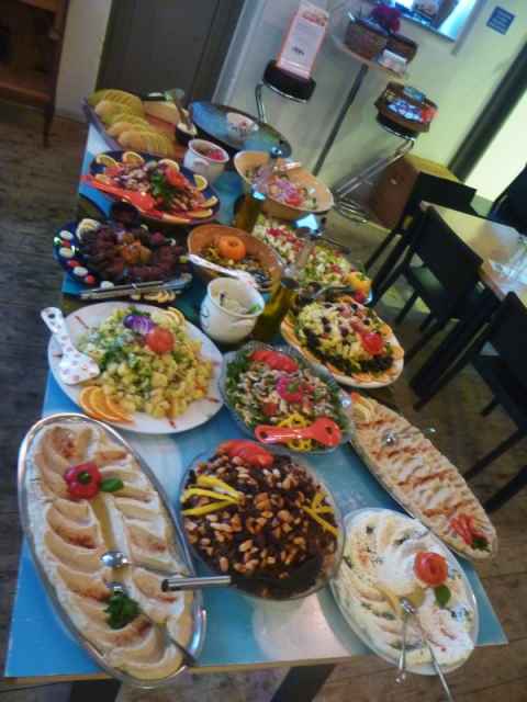 This little "Multicultural Center", way out in Botkyrka, serves up a fantastic brunch buffet of Mediterranean and Middle-Eastern food on select Sundays. Besides the buffet, one can order American pancakes, waffles, or a number of other dishes. If you can do without the pancakes, the buffet is served for lunch Monday to Friday between 12 - 14. The food is great and makes it well worth to take the tube to Fittja. But don't take my word for it: Dagens Nyheter reviewed the brunch[b], and gave it a 5 out of 5, which puts it well ahead of the majority of brunch-places in Stockholm.