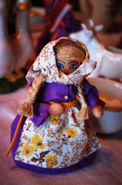 A purple Easter-Witch[a] doll. Children dress up like this for "trick or treat" (except there is no "trick" in Swedish tradition).