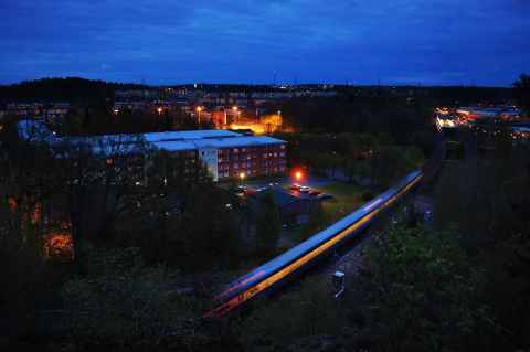 This is a view of Vårby Gård from Vårbergstoppen, an artificial hill nearby. Like Granholmstoppen and Frösundatoppen, it consists of junk left over from civil engineering projects - in particular, the masses of rock that were drilled out to build the subway.