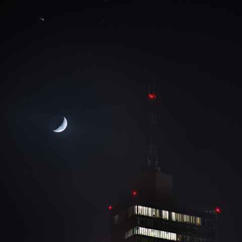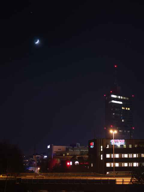 Moon over Kista. With the sky being clear, I figured I wanted a shot of it and Kista Science Tower. After som checking with Stellarium[a] and Google Earth[b] I figured out the time and place to be. But the big problem turned out to be the HDR merge. The moon moves, and the bright parts are as bright as mid-day light, while the dark parts are as dark as a star-lit night without atmosphere. This means that you have an exposure range of 25 seconds down to 1/160th of a second, or a 12-stop range. With two stops between shots, you're looking at seven shots. Say 10 seconds between shots to dial in the new exposure and wait for the camera to stop shaking. Then the exposures: 25 seconds, 6 seconds, and then some at 1 second or less. A total of 100 seconds, give or take. During that time, the moon has moved a distance across the sky almost equivalent to its own diameter. The overlap between the first and last HDR exposure is basically none. So I went to Hugin, stacked and fused the images, and the merged it with a single exposure of the ground. Here are the results.