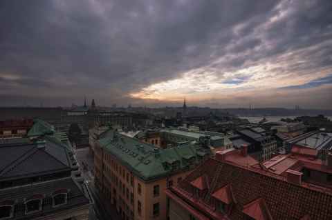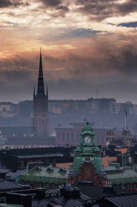 In the midground is the spire of Riddarholm Church, one of the oldest buildings in Stockholm. The cast iron spire is from 1835, when it replaced the previous spire that had been destroyed by lightning.