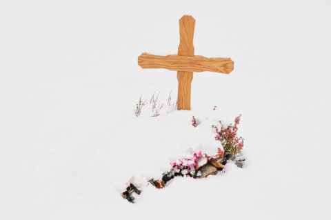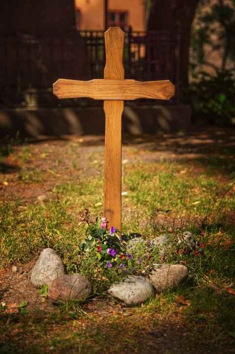 Just outside the main entrance of St Clara Church is a small wooden cross without a name, surrounded by a small ring of stones and flowers. It's the grave of Lennart Hellsing[a], a writer and translator who is perhaps most known for his children's books.
