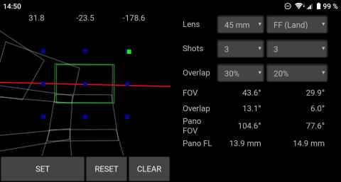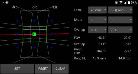 Shots: Select the number of shots in the panorama. First number is horizontal, second vertical.