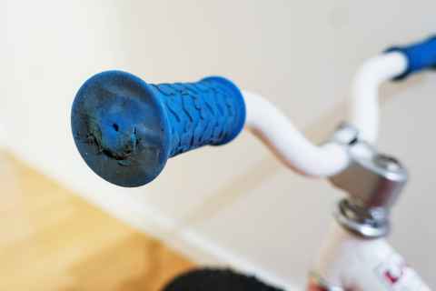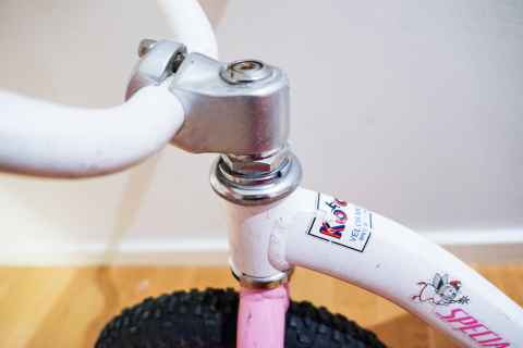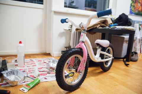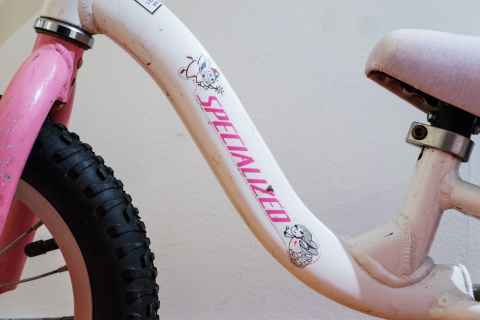 It was by way of Berm Peak that I found out that training wheels are out and balance bikes are in[a]. I found a Specialized Hotwalk[b] for only 300 SEK ($28), and it was obvious that it had been used and loved. It was rusty and worn, with the wheels going tickticktick when you tried to spin them.