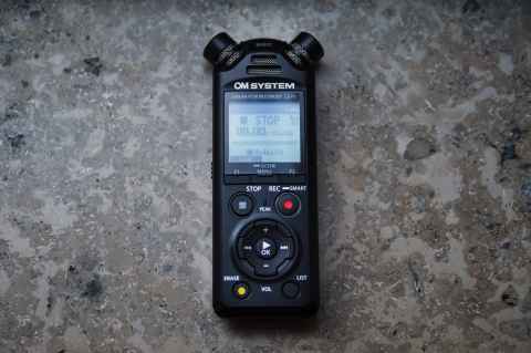 The LS-P5 can be used as a separate recorder as well as an external microphone. For this you may want to consider a shock mount, like the Movo SMM5-B[c] to minimize handling noise from the camera. The OM System tutorial[d] skips over a few things, though. First, to actually get any sound going from the LS-P5 to your camera, you need to press the recording button. Second, since you are sending the headphone output from the LS-P5 to the microphone in connection on the camera, you need to set the microphone recording level on the camera and the headphone volume on the LS-P5. For this I recorded a test tone and then just clicked around until the VU meters on the camera and the LS-P5 looked about the same, and found that setting microphone sensitivity to 15 or auto on a Nikon D3200 and a Nikon D600 corresponded to a headphone volume of 03. Sensitivity 10 had a matching headphone volume of 07. Your mileage may vary, so do run a sound check on your own camera, and I'd treat the camera recording as a backup the way the tutorial recommends. For a recorder that is intended for and marketed for use as an external microphone, it's an omission that there isn't a button to automatically set the headphone output level to mic level; especially as too high an output can actually damage the camera.