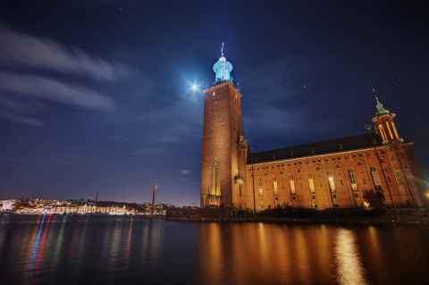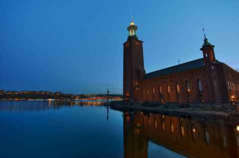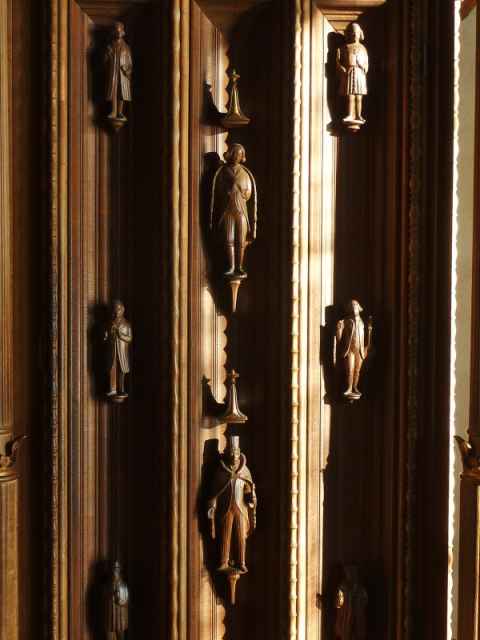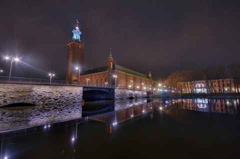 Mosaic in the Golden Hall. The woman in the center is the "Queen of Lake Mälaren" (an old nickname for Stockholm), sitting in the center of the world, with The East and The West to her left and right. A couple of fun historical facts: First, the art critics of the day were not merciful to the poor woman in the center. She was universally condemned as being just plain ugly and not representative of Stockholm. Since the artist had used his own wife as model, that criticism hit very close to home and he explained her appearance thusly: "Her eyes are big, so she can watch over the citizens, her feet are big so she can stand firm, and her hair symbolize the Sun (and not Medusa's snakes, as had been asserted)". The second fun fact is that it took a couple of years to finish the mosaic, only for the workers to realize they had made a huge mistake. As you can see on the photo, the bottom edge of the mosaic is a slight bit above the floor, and the top of the mosaic is a slight bit below the ceiling. What happened was that the artist in charge forgot about the bottom padding, and the whole mosaic is therefore about a foot too far up. Of course, by the time this was noticed it was far too late to do anything about it and still make the deadline. This isn't really noticable on this side, but near the entrance to the Golden Hall there is a picture of Stockholm's patron saint, St. Erik, whose head has been chopped off by the ceiling.