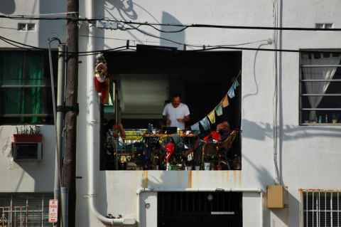 The top of the first stage is seen to the left and the five nozzles of the second stage to the right. The interstage covering has been removed, and also not shown are the solid-fueled ullage motors[f] that accelerate the stage to ensure that the propellant is pushed "down" towards the engines prior to liquid-fueled engine ignition.