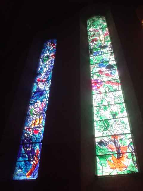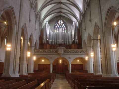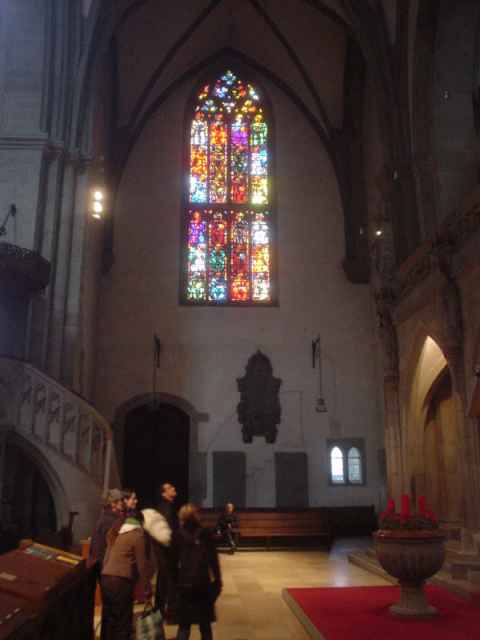 The interior of the church is in a spartan Calvinist style with none of the almost overwhelming amount of decorations one can see in a catholic church. The church had a set of three stained glass windows at the back, though. To the right (but not visible in the picture) is the entrance to the silent meditation room, and a sign informs visitors that they should "listen to the silence" while being in this part of the church.