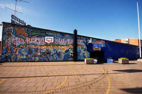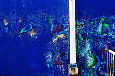 The whole piece, in all its glory. This shot is primarily intended for documentary purposes and is a 185 megapixel image that I assembled from five composite images. It is the first time I do a composite of composites, and this is the so far biggest image I've produced. Since the whole wall couldn't be seen from one spot, I moved between five different locations. The result is that some items (like the black column in the middle) are seen from both left and right, and nothing above the wall matches; as well as nothing surrounding the entrance to the youth club. I've not spent any time trying to get those bits to fit - I figure you're here for the piece and nothing else. The worst bit is the part behind the basketball basket. I stuck the camera in below the basket and then warped the resulting image into place, but at the top of the space where the basket used to be the image underwent considerable distortion. The sky is from a photo taken in Husby. The sky was horribly overexposed in the original, and I thought I would just cut it away - but that didn't work; the big empty area was too distracting. So I figured I might as well put some sky in there. It is a poor comp job, I know. But it's not the point of this image.