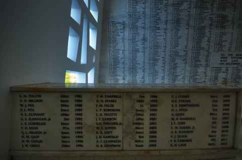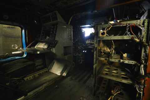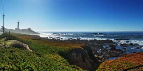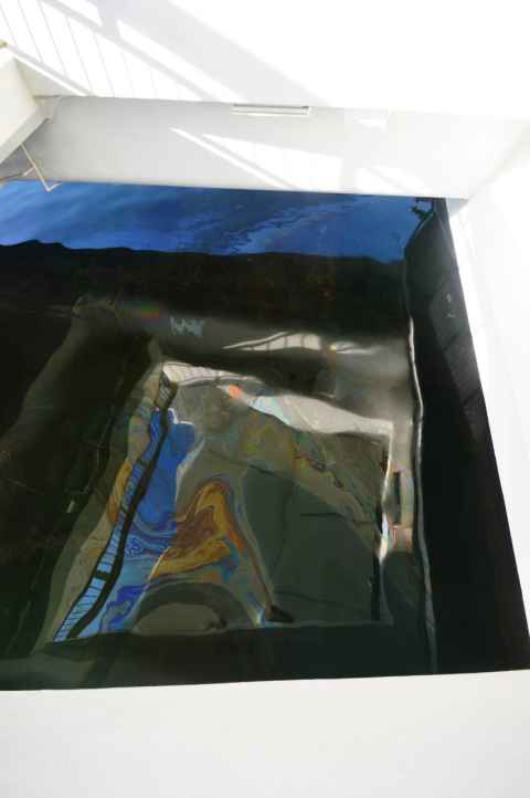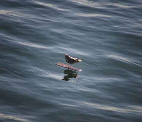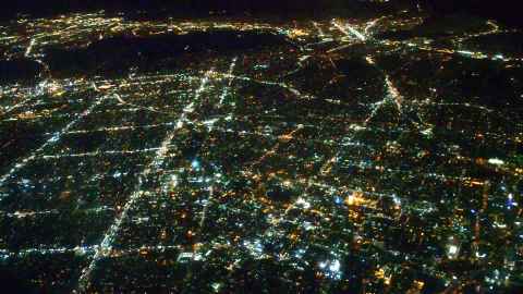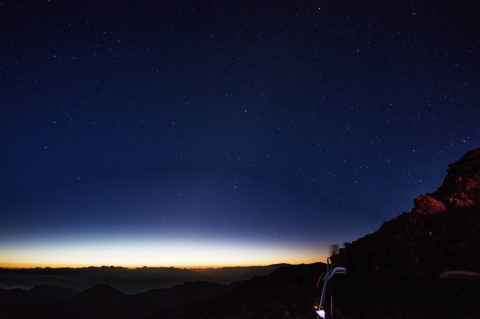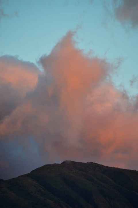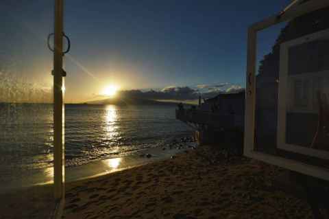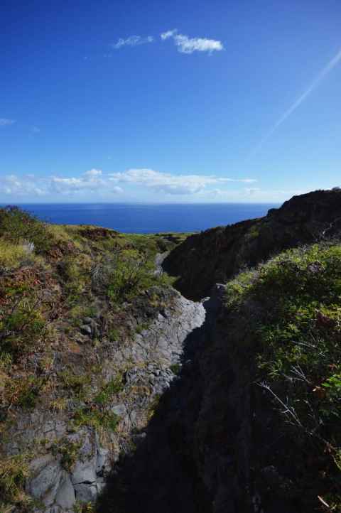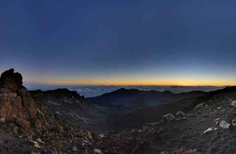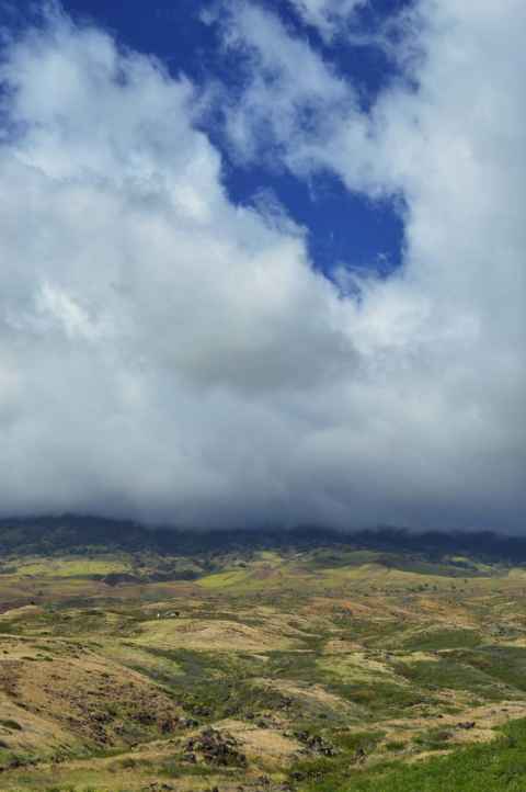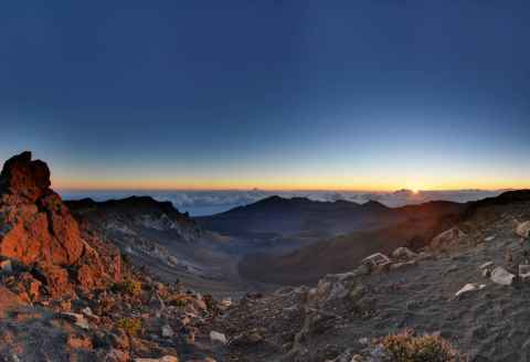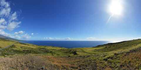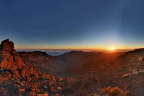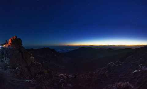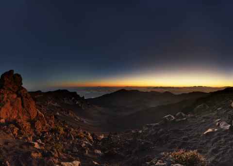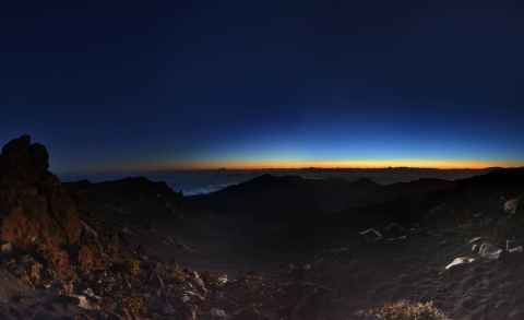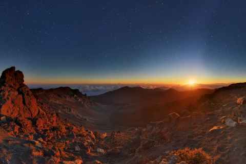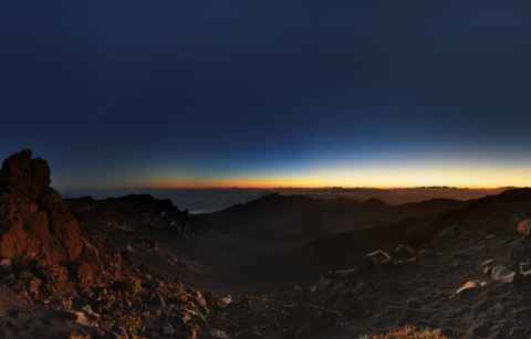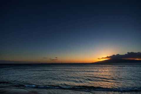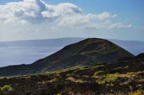 The shadow of Haleakala is seen as a blunt triangular shape on the ground and sea.