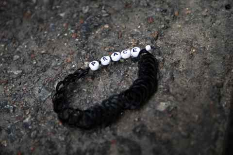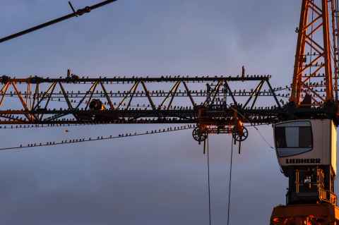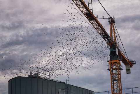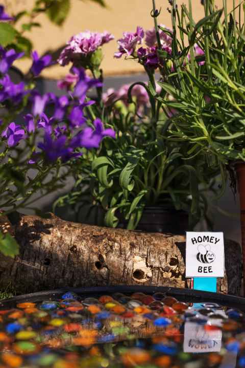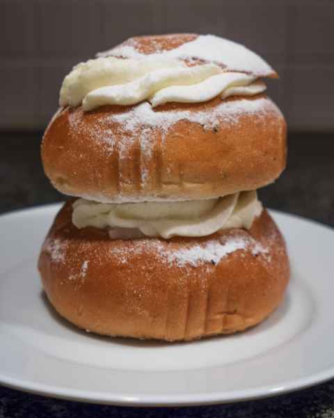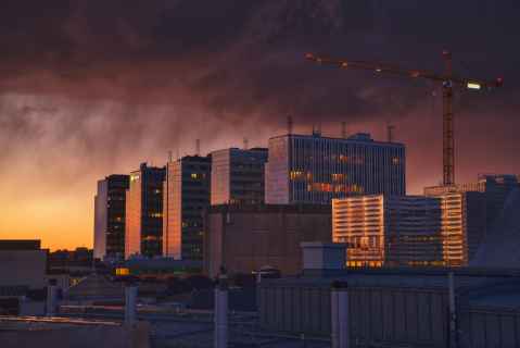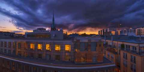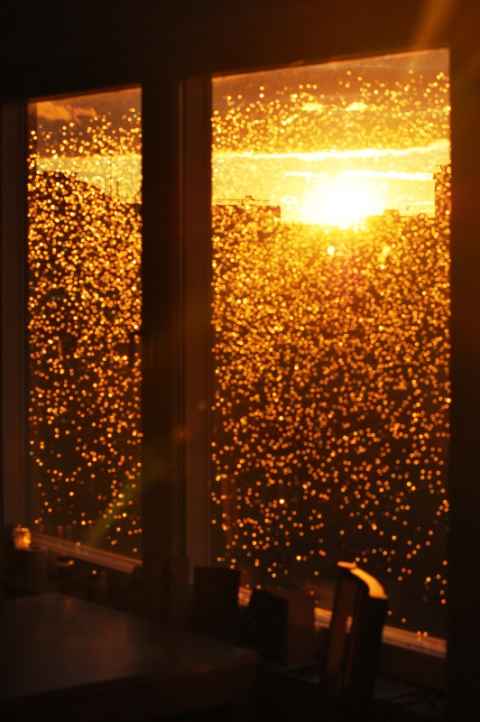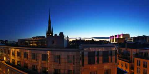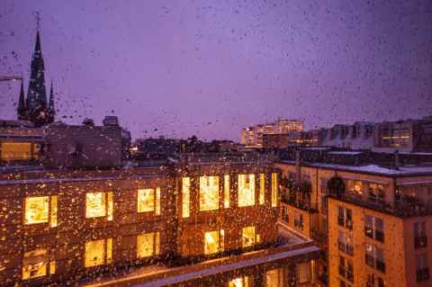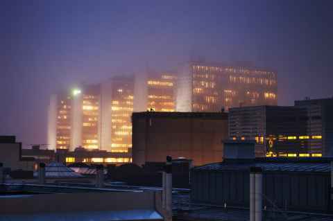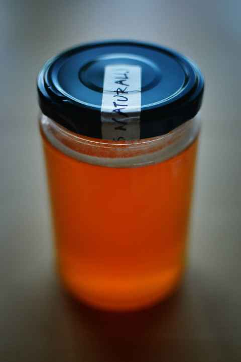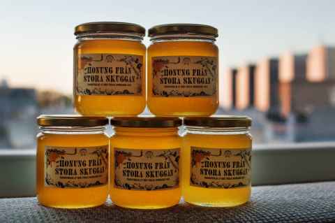 Two jars of honey, in an urban setting this time. The blurred shapes of Hötorgshusen can be seen in the background.